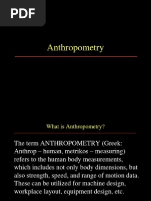 1650 research boulevard rockville. The main focus of the standards are the definition of landmarks and body measurements. Anthropometry involves the systematic measurement of the physical properties of the human body primarily dimensional descriptors of body size and shape. Body measurements and the evaluation of human nutrition body measurements and the evaluation of human nutrition brožek josef. In the past variances in body dimensions and configurations were typically reported as means and standard deviations for various body segments roebuck kroemer thomson 1975this approach was successful in delivering general broad parameters for protective equipment sizing but was deficient in generating the detailed fit information needed for. Defines anthropometry as the science of measurement and the art of application that establishes the physical geometry mass properties and strength capabilities of the human body.